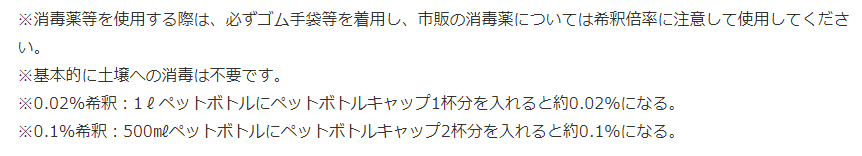 10% 塩化ベンザルコニウム・・・逆性せっけんと言われるものです。ドラッグストアや薬局で購入できます。使用の際は希釈(水でうすめる)が必要ですので、表示をよく読んで使いましょう。