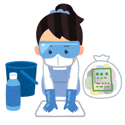 清掃する際の服装ですが、長袖・長ズボン・・厚手のゴム手袋・厚底の長靴や運動靴(屋外や床下)・マスクは実需品です。
